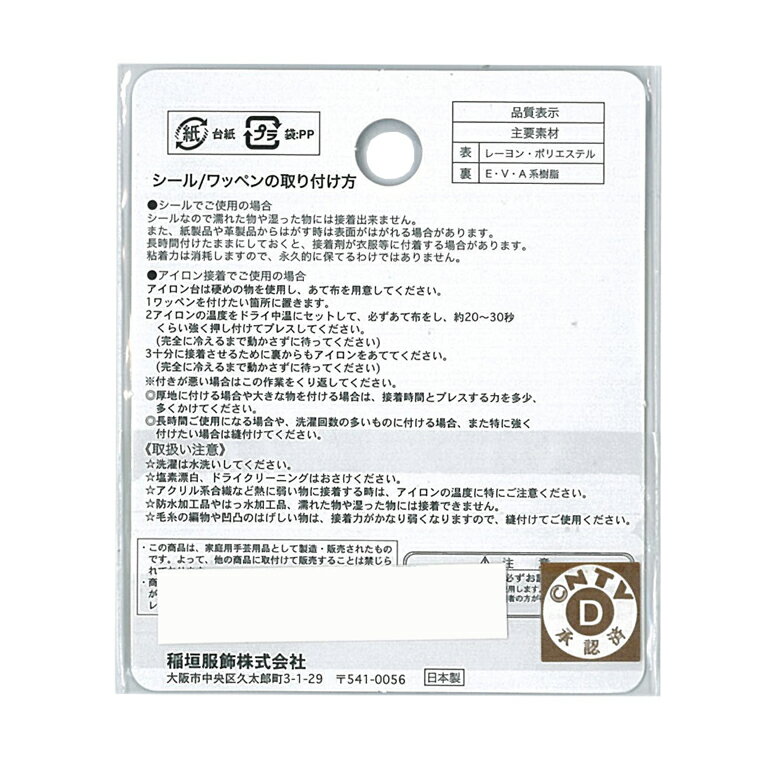 セット内容 ワッペン×1枚 商品サイズ ・ワッペン:約2.6cm×4.1cm・パッケージ:約6.5cm×7.6cm 材質 ・表/レーヨン・ポリエステル・裏/e・v・a系樹脂(エチレン・酢酸ビニル共重合樹脂) 製造国 日本 シールでの使用の場合 ・シールなので濡れた物や湿った物には接着できません。