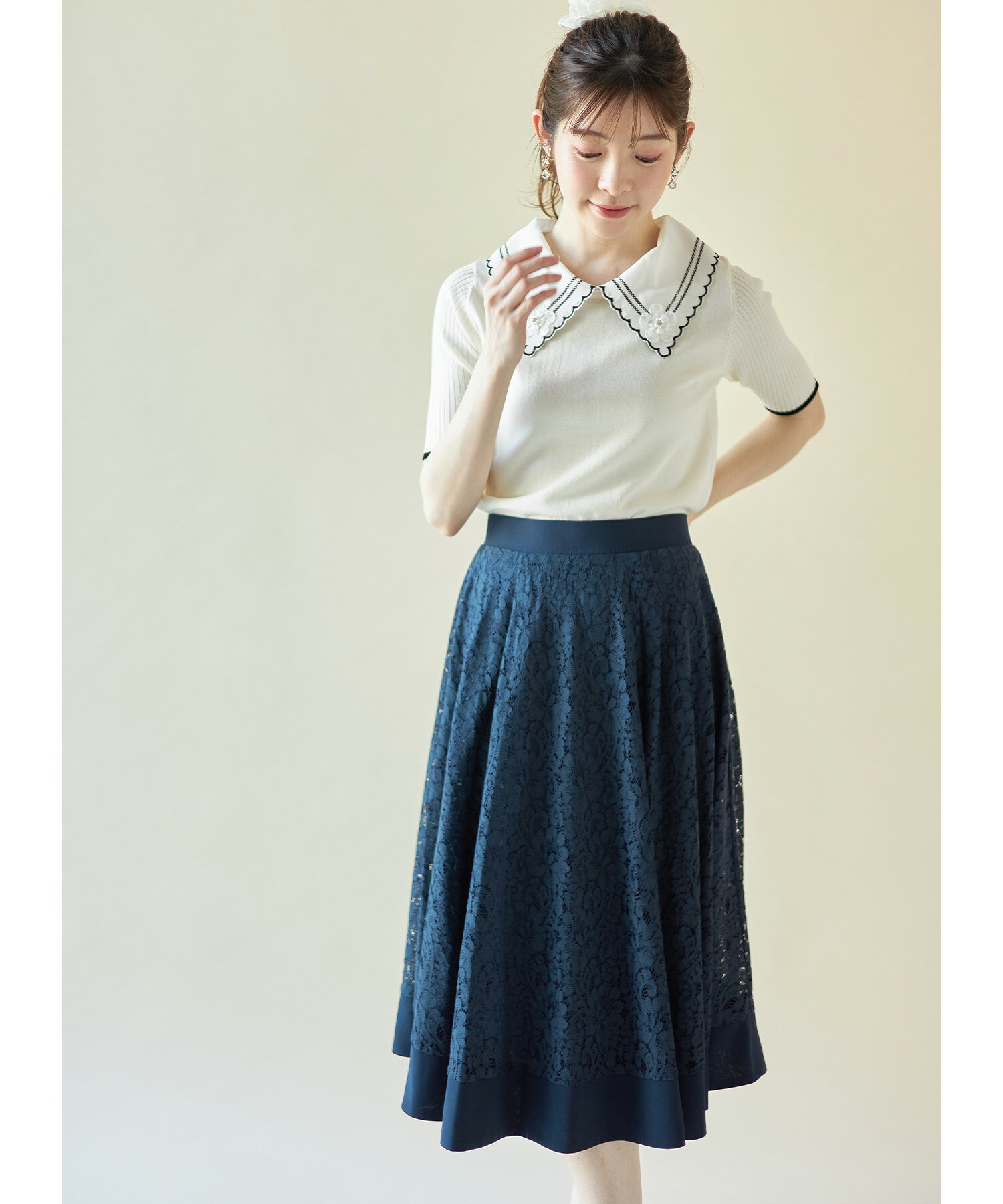 ONもOFFも活躍するレディの鉄板♪切り替えフラワーレースフレアスカート【remard リマード】tocco closet(トッコクローゼット) 道重さゆみさんはネイビーを着用 アイスブルー ブラック ネイビー ホワイト グレイッシュピンク