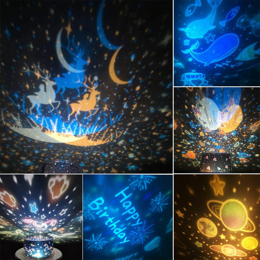 【投影映像*寝かしつけ用おもちゃ*ベッドライト*音楽再生多機能】最新版四つのボタン!映像フィルムモードは「海、ローズ、鹿星空、誕生日お祝い、宇宙、回転木馬」或いは「海動物、恐竜、サンタクロース、誕生日お祝い、宇宙飛行機、回転木馬」6種類映像フィルムをランダムに付属しています。