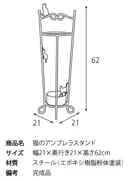 届いたその日からすぐにお使いいただけます! 商品名猫のアンブレラスタンド サイズ幅21×奥行き21×高さ62cm 材質スチール(エポキシ樹脂粉体塗装) 備考完成品