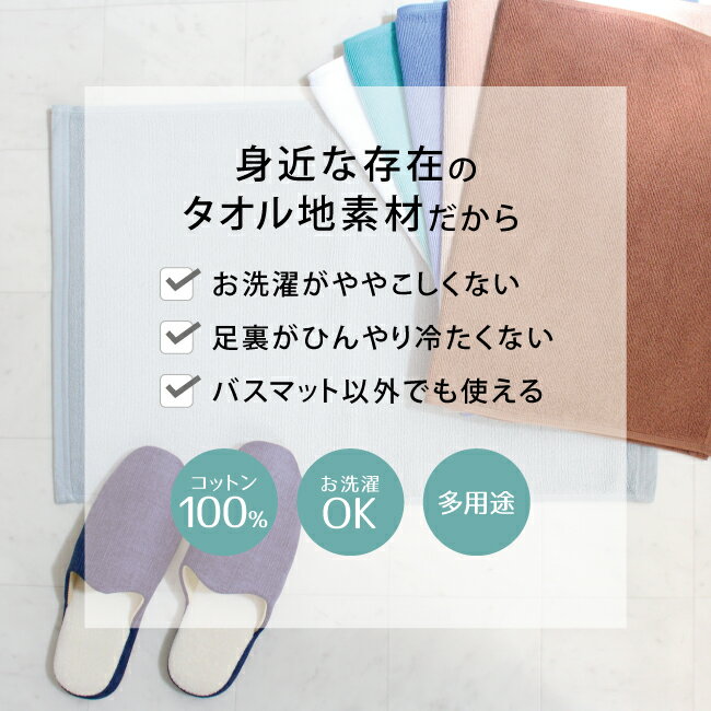 ◎ご家庭でじゃぶじゃぶ洗えるタオル地バスマット 毎日使うものだからこそ、手軽に使える綿100%のタオル地バスマットがおすすめ! ◎シンプルな無地のバスマット やっぱり無地が使い勝手抜群、バスマットは勿論、キッチンマットや玄関マット、トイレマットにも。