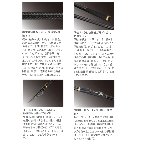 ゼロサム尾長V2シリーズのコンセプトを継承、基軸とし、その能力をさらに最大限に活かすべく高い技術、積み上げたノウハウを用いて、x4シリーズの特徴である高密度4軸カーボンを元竿から#2まで惜しみなく使用し設計、融合させております。