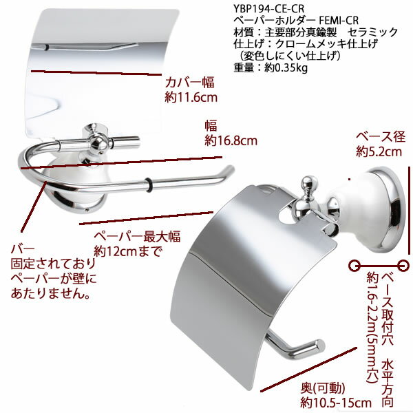 材質 仕上げ 真鍮製(主要部分) クロームメッキ仕上げ (水道の蛇口と同じような風合いです、変色しません) サイズ 重量 幅約16.8cmx奥行10.5-15cm(可動式)x高さ約12cm 0.35kg (商品によりばらつきがあります) アームの内寸法=12cm 取付ネジ間隔=1.6-2.2cm 原産国 台湾製 耐荷重 約5kg(トイレットペーパーホルダー以外の用途ではお使いにならないでください。