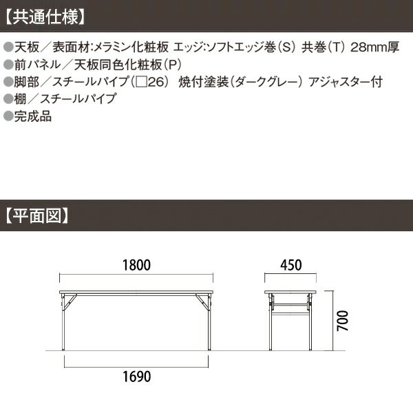 ------------------------------------------------------------------------サイズ横幅(W)x奥行(D)X高さ(H) mm1800×450×700共通仕様●天板/表面材:メラミン化粧板 エッジ:ソフトエッジ巻(S) 共巻(T) 28mm厚●前パネル/天板同色化粧板(P)●脚部/スチールパイプ(□26) 焼付塗装(ダークグレー) アジャスター付●棚なし天板形状角型※共巻[パネルなし]重量11.6kg納期についておおよその納期は、7?10日後の発送予定となります。