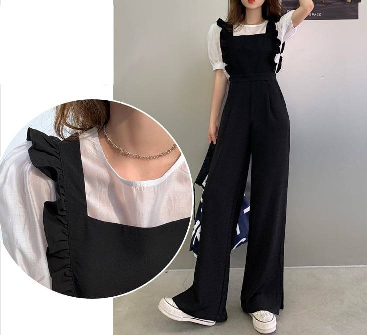 レディース サロペット つなぎ オールインワン ブラック 黒 フリル ノースリーブ 袖なし ロングパンツ 長ズボン 膝下 ワイド セミワイド ハイウエスト ハィウエスト タック タック入り 脚長効果 体型カバー シンプル 大人カジュアル カジュアル